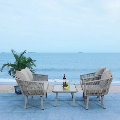 The classic barrel chair gets a streamlined modern update in this Belmi 4 Piece Outdoor Living Set. Featuring two arm chairs, a loveseat, and smooth glass top coffee table, the timeless silhouettes of Belmi’s seating is transformed for today’s outdoor entertaining with gray rope details and matching gray cushions. This conversation set adds a fresh look to any outdoor space.