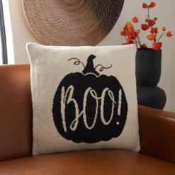 Announce itÕs time to break out the candy and spiced cider with this seasonal Boo Pillow! Featuring a playful pumpkin silhouette emblazoned with the favorite phrase of ghosts and ghouls in a whimsical script, BooÕs soft natural and black knit cotton makes it a staple in farmhouse-chic living spaces. Care Instructions: Dry clean only