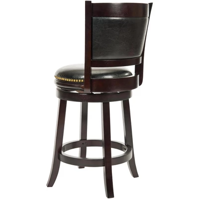 The Brockway Counter Stool is designed to give your home fashion and function with a frame crafted of Malaysian Oak with a cappuccino finish and a swivel seat covered in black bi cast leather. The seat back features an inset cushion, also covered in black leather, for comfortable sitting at counters and pub tables. The seat height is 24 inches. Assembly required. Care Instructions: To prevent overall soiling, frequent vacuuming or light brushing is recommended. Cushions and pillows should be turned on a weekly basis. Down filled cushions should be brushed rather than vacuumed. Spot clean, using a mild water free solvent or dry cleaning product. Only a professional cleaner should undertake a complete overall cleaning. The use of steam or water based cleaners may cause excessive shrinking or staining.